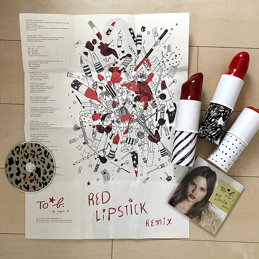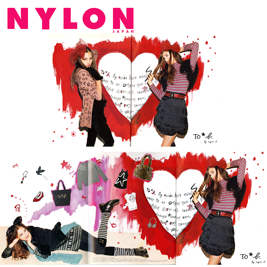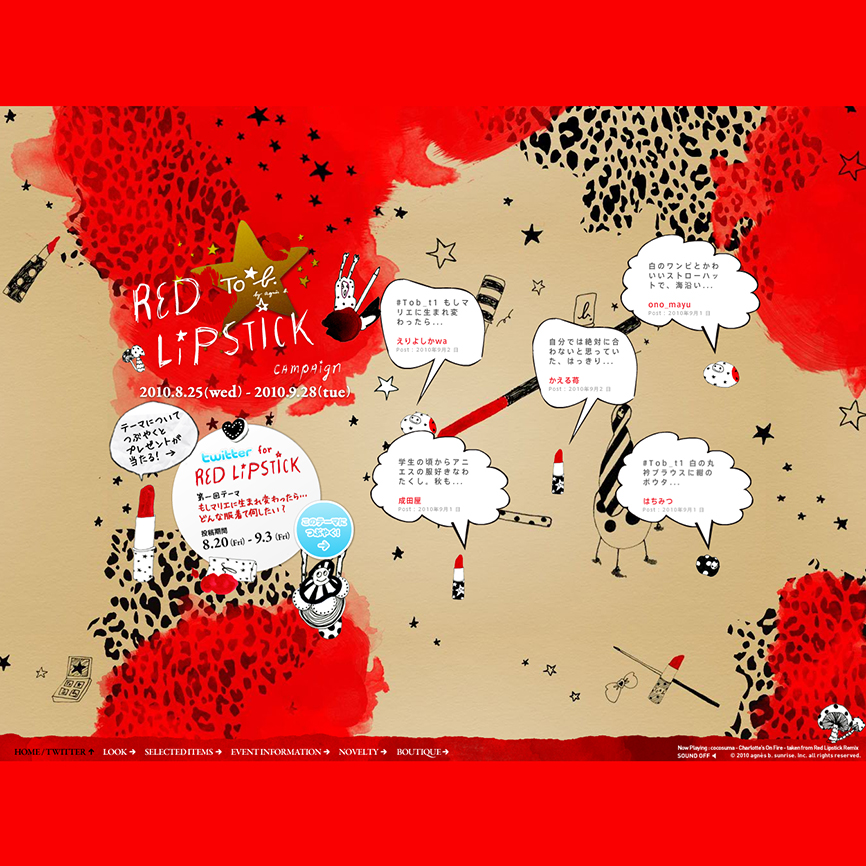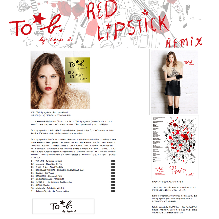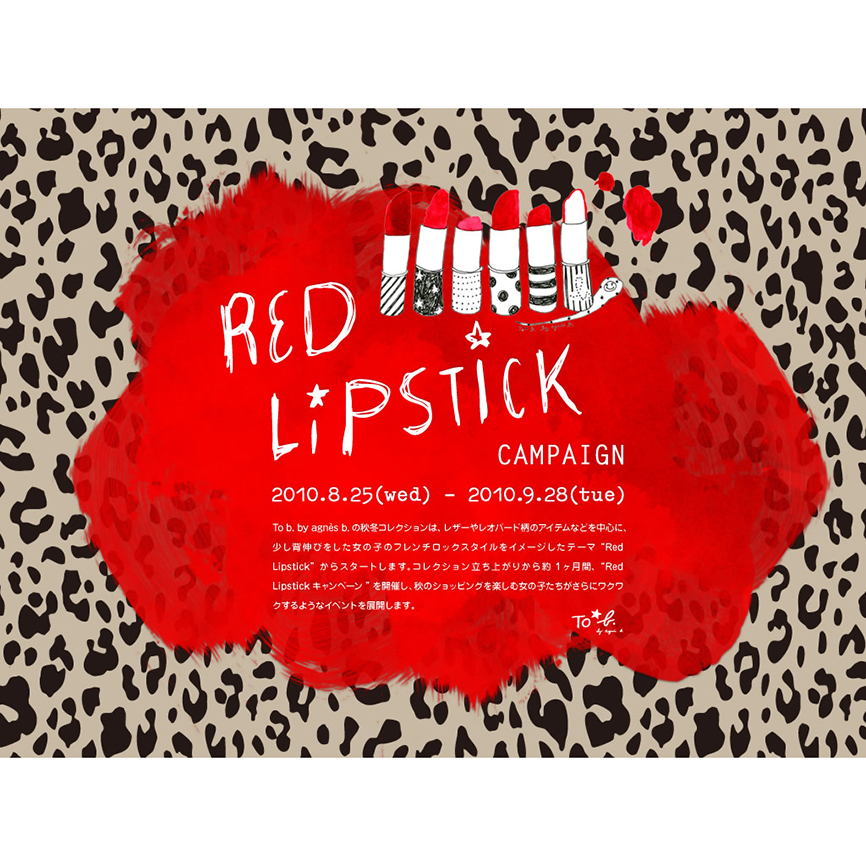 2010年は、To b by agnès b.の立ち上がりから春夏秋冬全てのシーズンを通して数々の商品のアートワークに関わりました。春夏シーズンは、キノコで描かれた「yes」「no」のアートワークがメインになり、新宿伊勢丹にて開催されたスペシャル・イベントではトーク・ショーにも出演。秋冬は「Red Lipstick」をモチーフに、バッグ、Tシャツ、キーホルダー、クッキー等、数々の商品に関わりました。