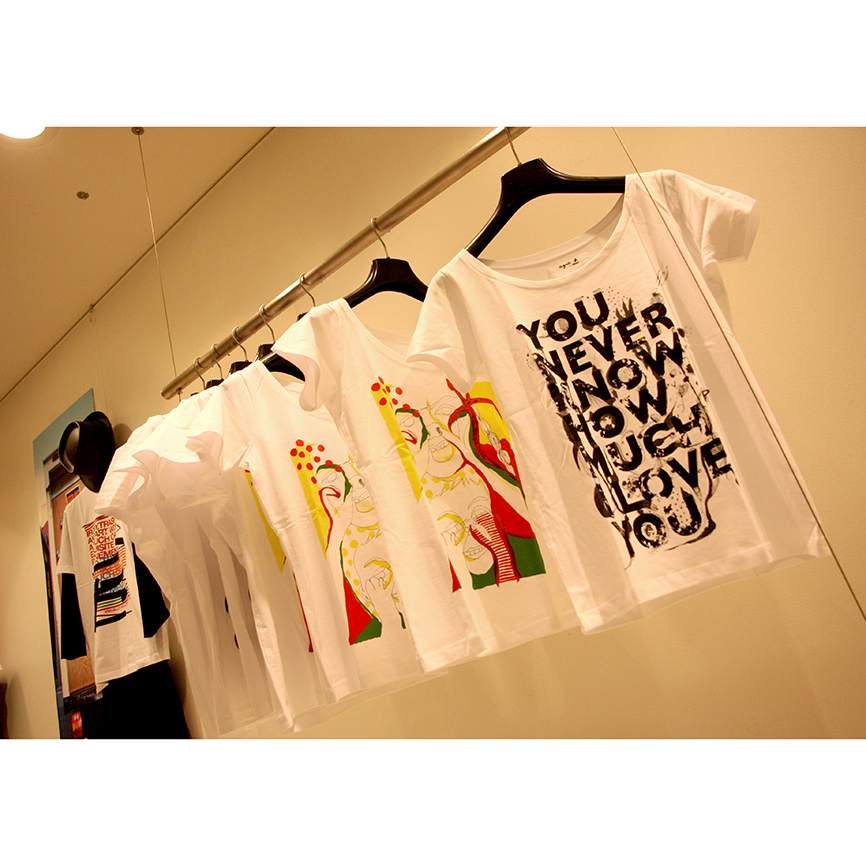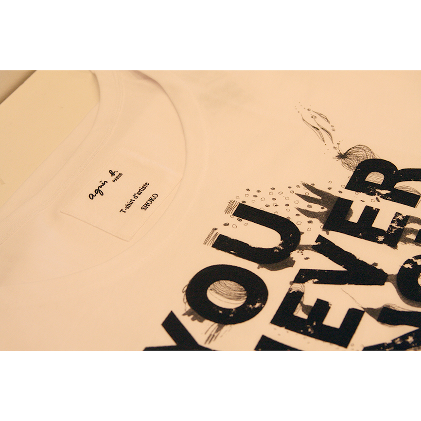 2008年春夏アニエスベー・アーティストTシャツby SHOKOは、2つの絵柄が発売。「YOU NEVER KNOW HOW MUCH I LOVE YOU」と書かれたタイポグラフィーベースのアートワークは、SHOKO初の個展「Feel the warm heart」展のコンセプトと直結し、ダイレクトに愛を表現したメッセージ。滑稽な子供達の表情がカラーで描かれた作品「Let's all laugh at the war」は、私達人間に、